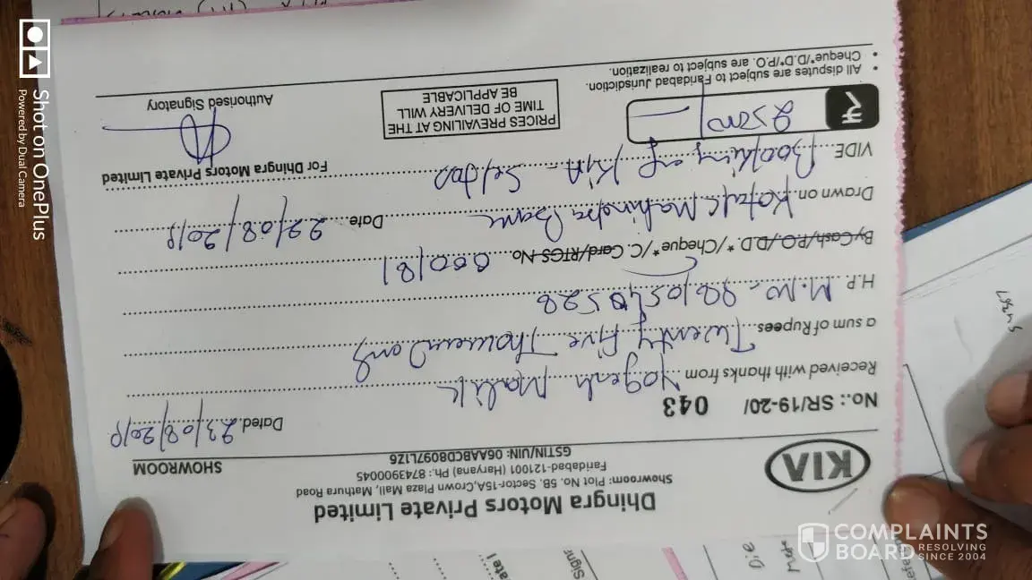 This is in regards to Kia Booking done by me on 22nd August 2019. I ordered HTX+ Diesel Automatic from Dhingra Motors Faridabad.
