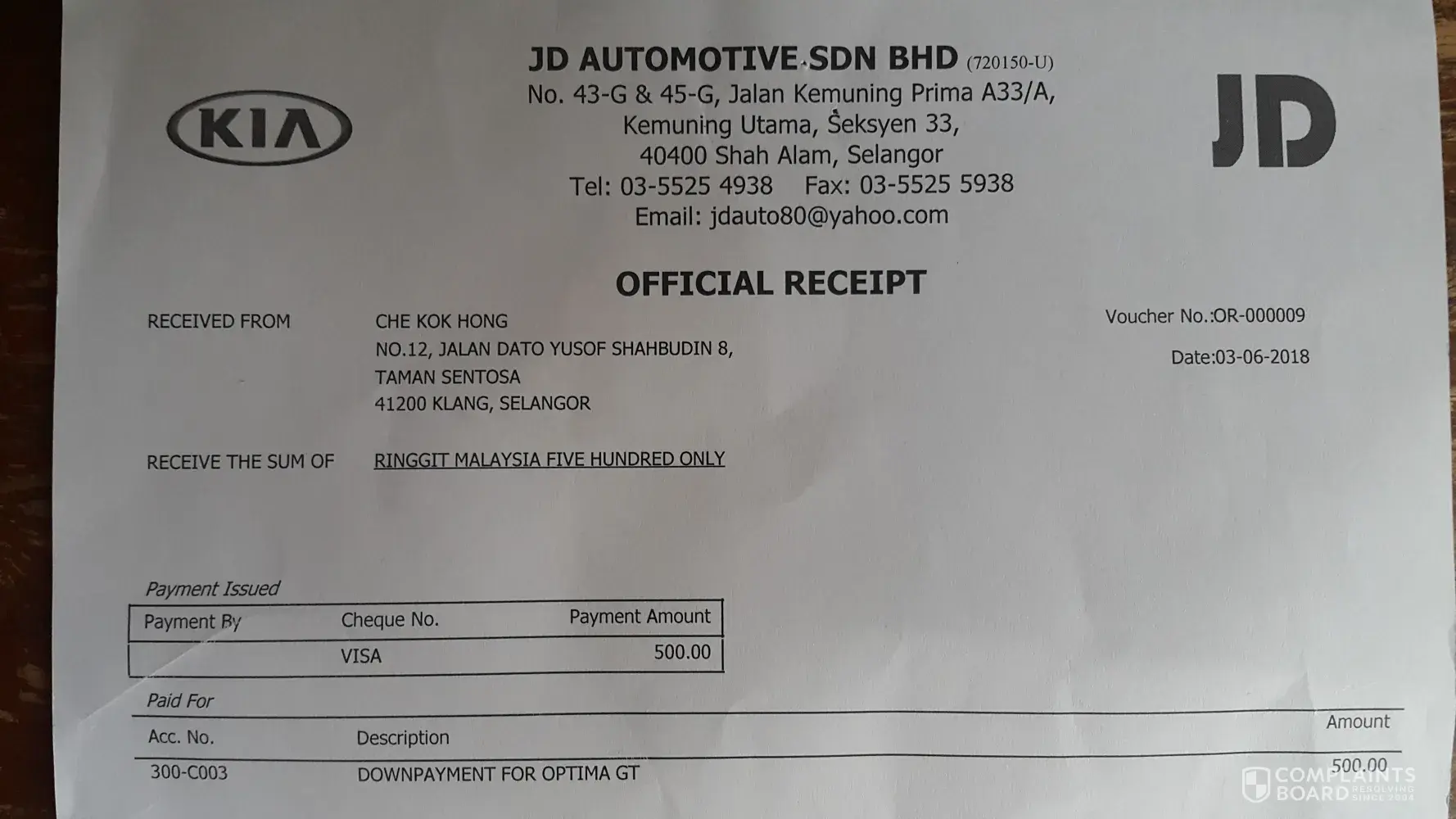 My Name is Che Kk Hong, I am a Malaysian, I intend to change new car during GST free period to enjoy cost saving, same time KIA also offer me with festival discount of RM 15, 000.because of the atractive offer, I make a booking for KIA Optima GT at one of the Sale Office at Malaysia name JD Automotive SDN, BHD on 3rd June 2018.