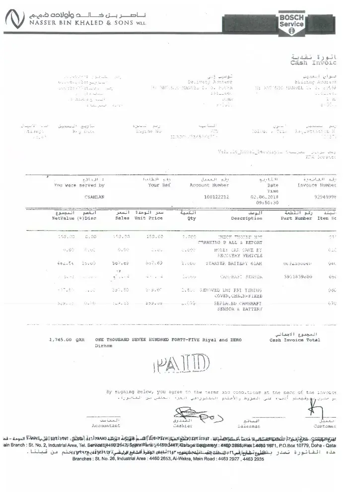 I have a KIA Sorento (engine nbr. KNAJC523165566578) from 2006, that I have bought in Doha, Qatar. Current mileage is 93.482 km. All the services have been made at KIA Doha during all these years. Recently I found some problems on starting the engine and eventually the car stopped while I was driving it. I immediately towed the car to KIA services in Doha (Qatar) in order to fix the problem. After 2 hours waiting, the Supervisor informed that the issue was related to a engine failure and they (KIA Qatar) would carry out an assessment of the problem. I was asked to leave a deposit of QAR 1000, 00 (EUR 203, 00) and if after the assessment I decide not to fix the car, they (KIA Qatar) would return me only QAR500, 00 (assessment fee). I accepted and made a deposit of QAR1000, 00.