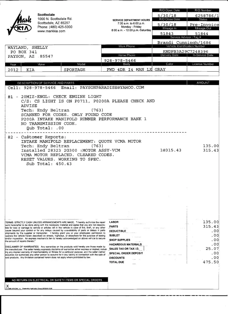 I purchased my KIA Sportage brand new in 2012. I did a lot of research and liked your automobile plus the extended warranty of 5 years, 50, 000 miles made my decision as I am single and did not want to worry about any repairs. My car has just over 50, 000 miles and know I am getting ck engine lights. Peoria Kia said it would cost me $740 to replace an intake manifold. Plus they said the transmission sensor needs replacing too. They took 5 hours to give me the bad news and then could not fix anything wanting to keep my car overnight. I live 2 hrs away and that wasn't going to work. I then took my car to Mark Kia who did a diagnostic also and they showed the same manifold sensor and no transmission sensor. Their charge was $475. Quite a difference. My problem is why am I even having these problems. I thought this was a very good brand of car, that I would have for many years and feel safe in it. Are these sensors timed to go off after 50, 000 miles? Everyone knows the money is in the service department. I already have to mess with the fuel credits each year, which is a pain. Is there anyway Kia would extend my warranty another 25, 000 miles. Just in case I have more issues. I would appreciate a response. Thanks