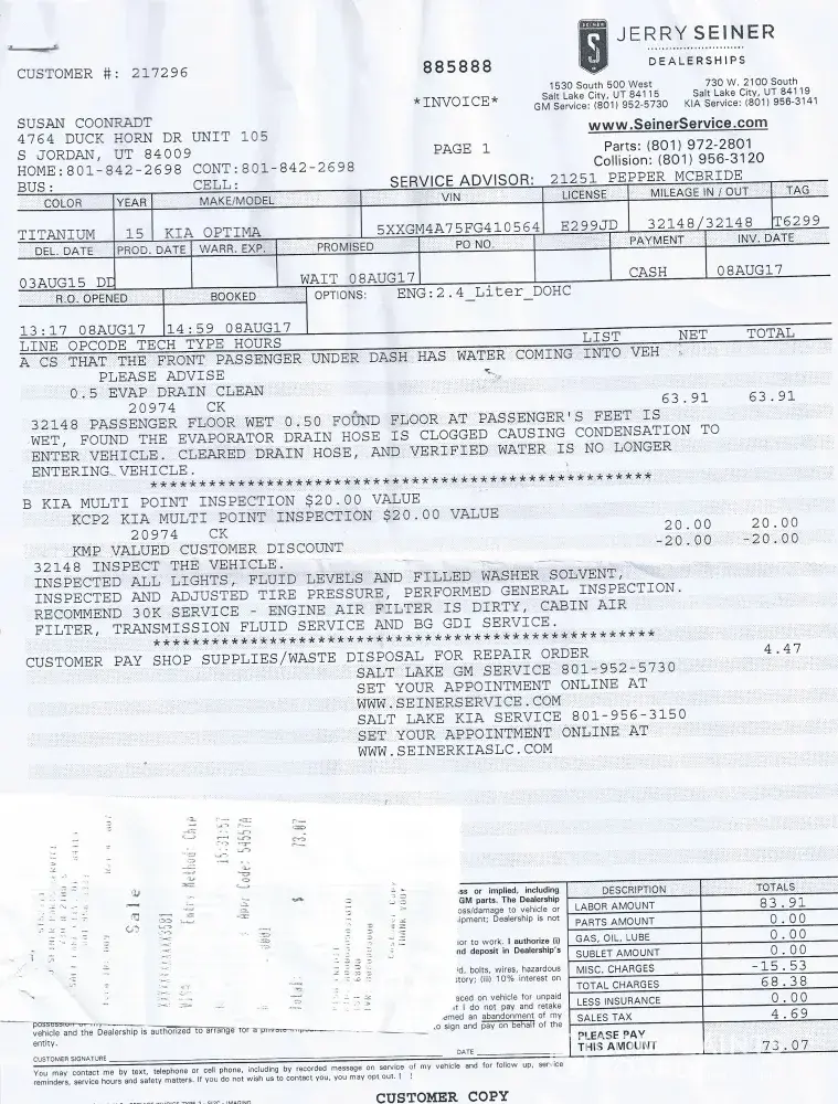 Large amount of water coming from dash on passenger floor. Took my Kia Optima in for service. They replaced an evaporator drain hose that was clogged causing water to enter vehicle interior. They advised me that this is a problem with KIA vehicles and that they have approximately 8 KIA vehicles a month that they need to repair due to the fact that the drain is too small in KIA vehicles causing the problem. I had to pay $73.07 for this service. They advised that KIA will not pay for this under warranty even though this is a defect in the vehicle. I bought a KIA vehicle because of the warranty since I am on a very limited income. And this was not covered. I feel that KIA should stand by there warranty and should reimburse me the $73.07 which I have a receipt for if you need it. I am 61 years old and have never heard of a vehicle leaking water inside a car. This has to be a defect as the dealer advised. Please reimburse me asap. I need this money and deserve it. Thank You. This repair was done August 17, 2017.