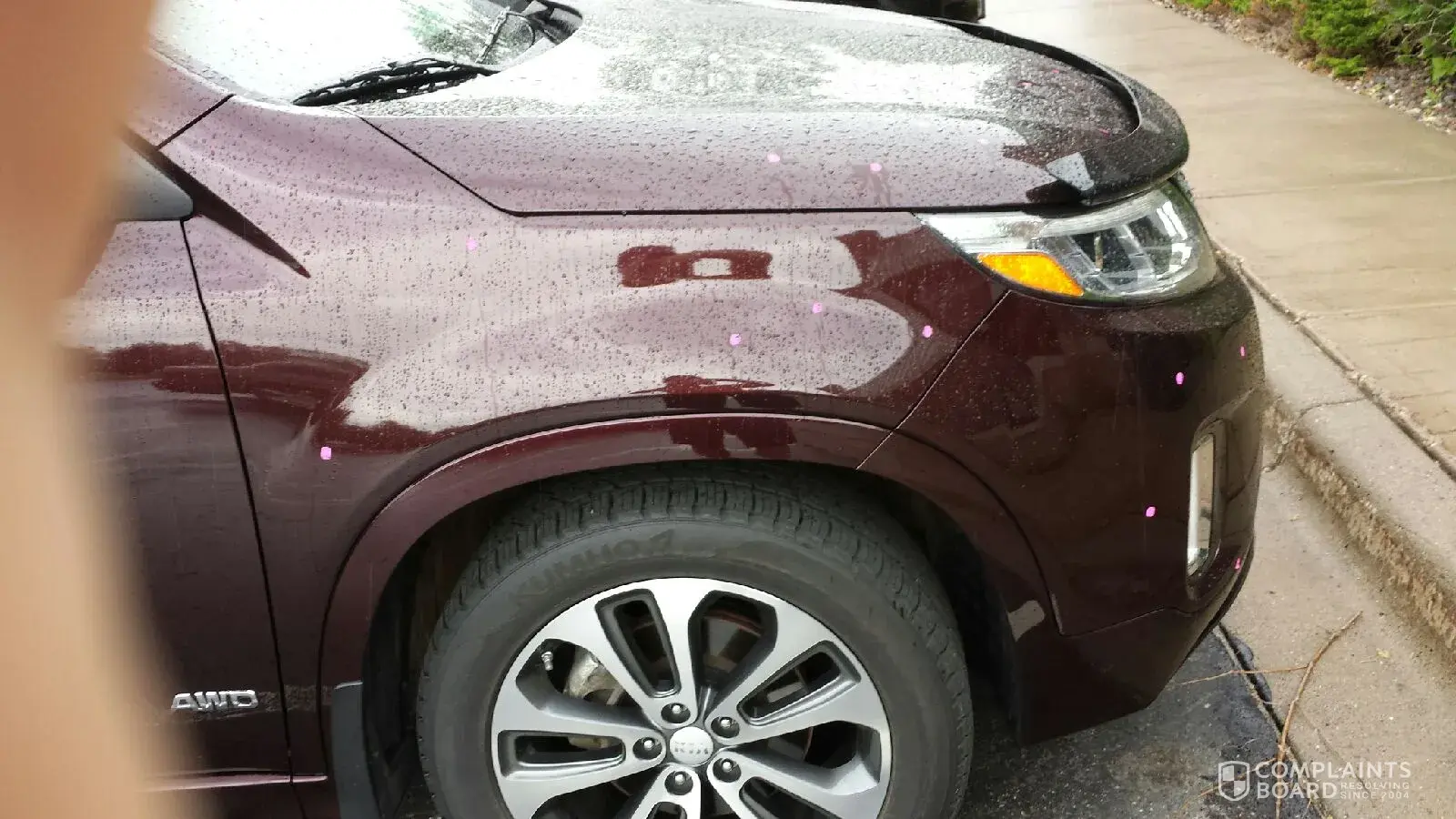 I have a 2014 KIA Sorento that has paint chips all over it. I even have some on the roof. I took it back to the dealer and they are saying it is paint chips. I am wondering how you get paint chips on the roof? The dealer did paint the hood for me as that was really bad over 50+ chips. The hood seems to be holding up much better then the factory paint job. Because of this it is safe to say that KIA does have a paint issue going on and needs to take responsibility for it. I took my SUV to a none bias auto repair shop. They stated the paint is water base paint and is painted on very thin. For this reason the paint will easily chip and fade. So far KIA is not taking responsibility for this but the dealers are trying to help some. But only if you have a fairly new vehicle and are considered a good customer. I do appreciate what the dealer did but feel that KIA needs to do a Recall and correct the paint issue on all KIA vehicles. I have attached pictures. The pink dots is the location of the chips that I could find easily in a 30 minute time frame.
