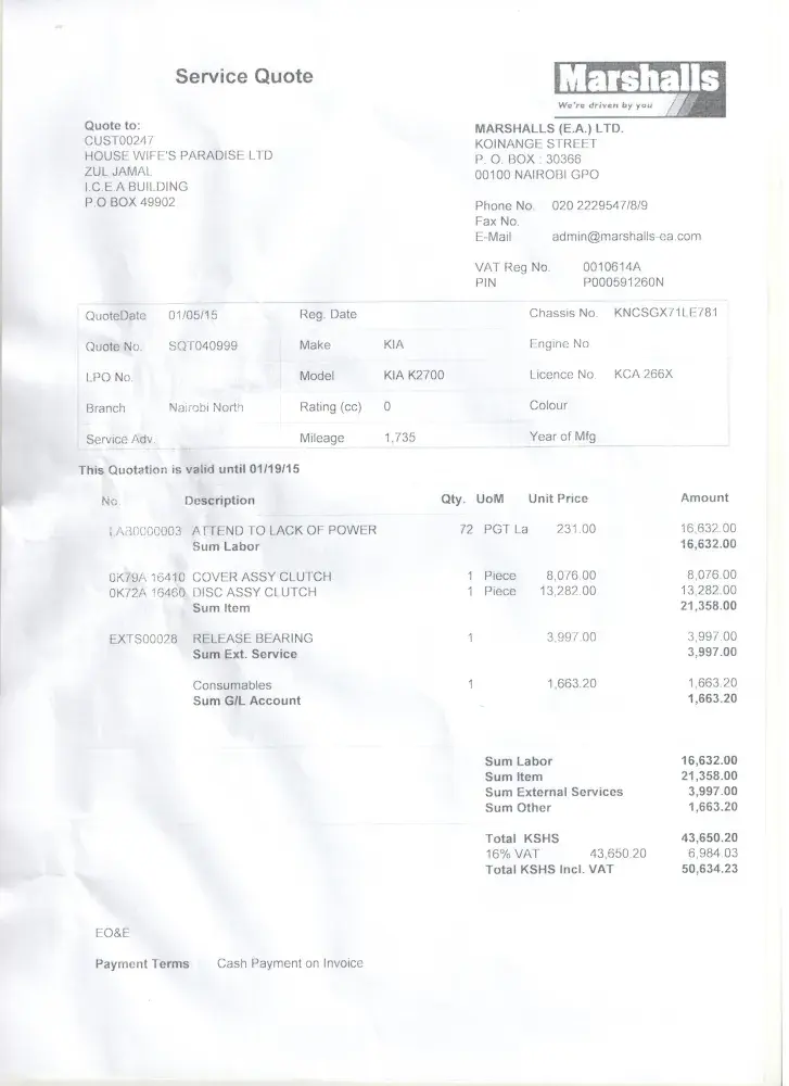 we purchased our third unit of the KIA K2700 light weight pick-up in October of 2014 as the vehicles have performed well for our business. on 29th of December 2014 the vehicle started loosing power on the road and stalled. we towed it to a safe parking awaiting Marshall's East Africa ltd the local distributor in Nairobi Kenya to resume work on 5th January 2015 as they were closed over Christmas holidays. we took in the car chassis # KNESGX71LE7814239 and engine # J2673441 to their service center on 5th Jan 2015 morning, they called us in the afternoon with a quotation amounting Ksh 50, 634.23 approximately US$ 570.00 being the cost of supplying and fitting a new Clutch assembly system as the original one had failed at 1735 kilometers ( 1, 085 miles) and their 100, 000 kms (62, 500 miles) or 3 year warranty would not cover stating user negligence. they would not consider that we have 9 vehicles in total of which 3 are the KIA K2700 being handled by seasoned drivers . we M/s House Wife's Paradise ltd are a 15 year old company and have been giving priority to purchasing KIA vehicles whenever possible. we believe that the clutch failing at merely 1735 kms is a manufacturing defect