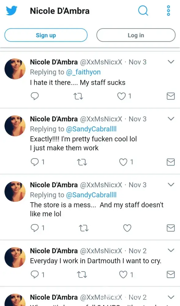 I am writing In anonymously as a store employee. We recently have a new manager who is not at all fit for this position. She is very unprofessional and recently took her opinions of our store and staff to social media. She is embarrassing, belittling and completely degraded us, making public comments such as "My staff sucks" on the internet for the world to see. She is always on her cell phone and has employees doing more than their share. Enclosed is a copy of her social media post about us. Again, I would like to remain anonymous because unlike Nicole Dambra, I take my job seriously. She is making a mockery of our location and the staff is very unhappy.