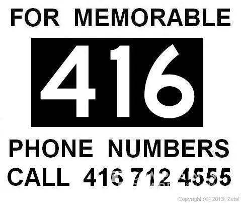 e.g. Top Notch 416 are numbers 416- 888-888X or 416-78-78-78-X or 416-888-X-888 or 416-XYZ-2000, 3000, 4000, 5000, 6000, 7000, 8000, 9000 or 416-XYY-1111, 2222, 3333, 4444, 5555, 6666, 7777, 8888, 9999, 0000 The finest numbers in Toronto!