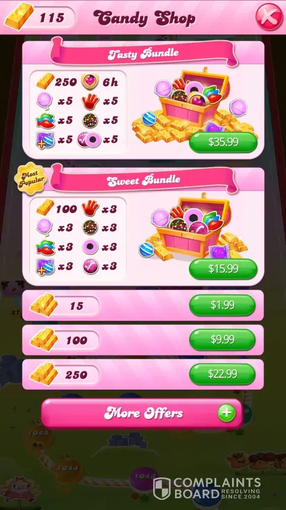 I just bought one of the combo specials to finish a level in my game and paid $15.99 charged to my card. I needed lollipops to complete it. So I bought the bars lollipops etc package. It put my bars in my account but not my lollipops or anything else. I ended up having to use my bars to buy 3 individual lollipops package for 19 bars which defeated the purpose! My account was not given what I paid for. I either need to be reimbursed or put the items on my account.