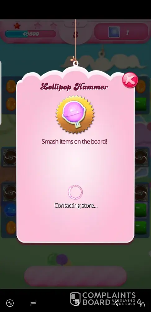 Then, as shown in screen pics I've taken, I needed to get rid of 1 more gel and went to use my coins to purchase a candy crusher. Well th the game was stuck to contact the store, and I eventually had to quit, losing the game. The timing of these things is inconstant.