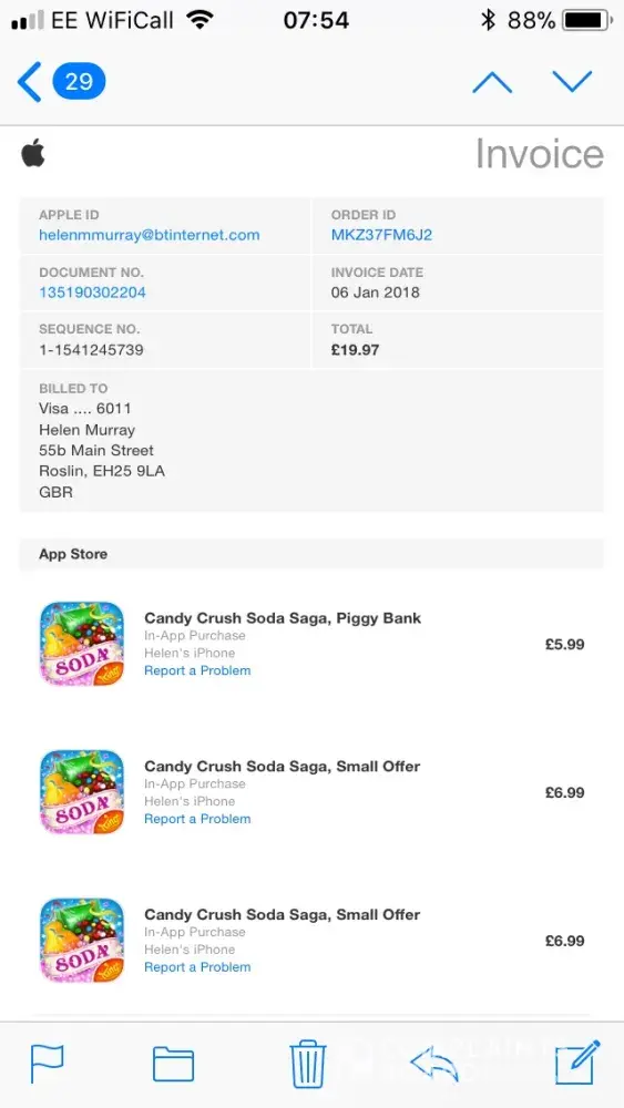 Hi, I bought one £6.99 bundle on 6th Jan but £19.97 was taken from my bank account. I have contacted the automated customer care Ana for King over 4 times and nothing at all had been rectified, I have sent a screenshot evidencing the payment on two occasions. Every time I am sent an automated message asking if my complaint had been rectified which it definitely has not.