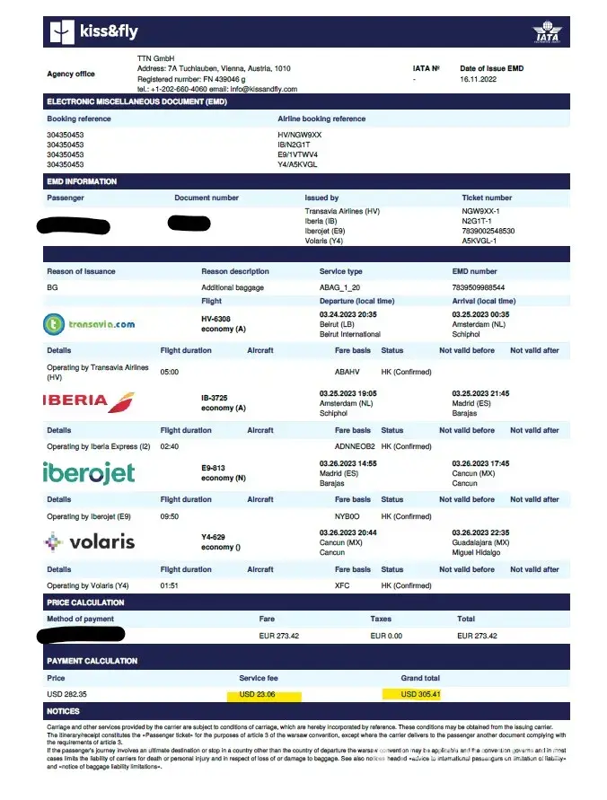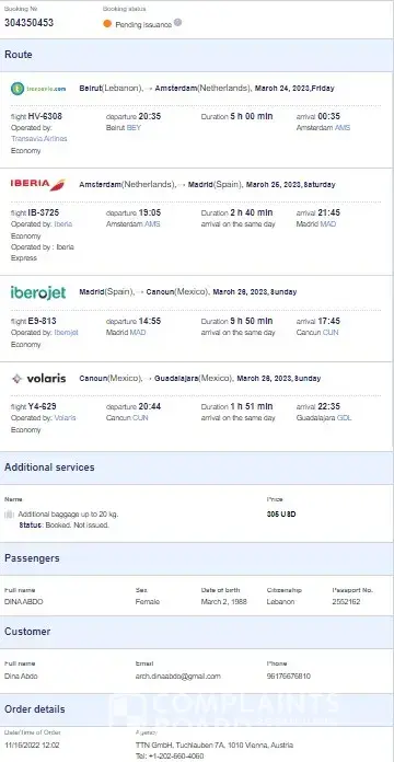 In addition, when asking about the itinerary tickets they sent me different from the one I received by email (when I booked it, I paid an extra 300$ for luggage ) they did not mention even when I asked them about it they change the subject. And when confronting them about it, they give an irrelevant answer.