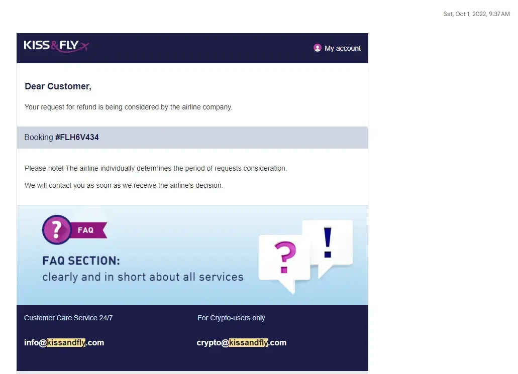 I have attached all of the relevant documentation above in the main post, including my flight confirmation, refund request, and correspondence with KissandFly customer service.