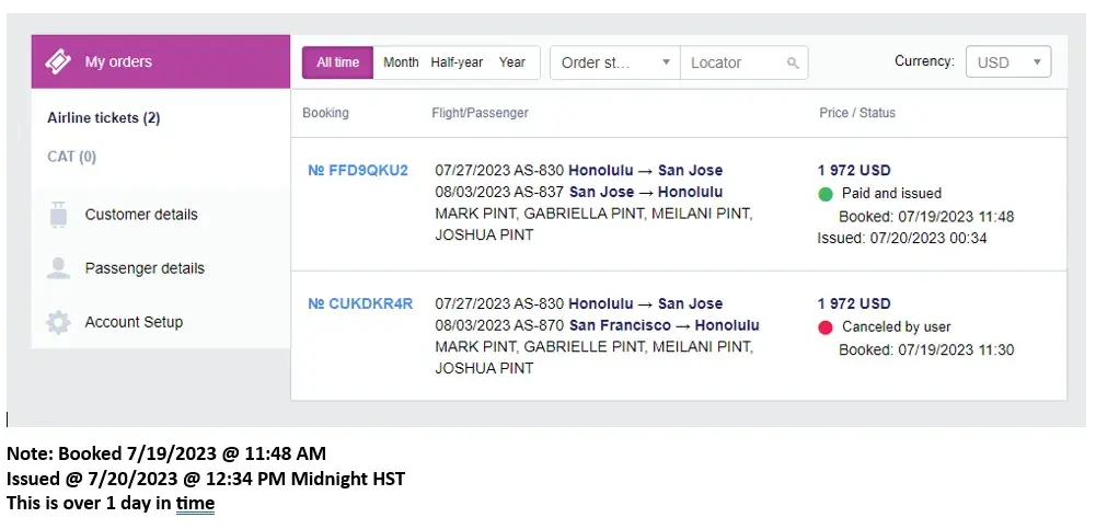 I originally booked tickets through KissandFly from Honolulu to San Jose, California on July 19th, 2023 at 07:30, I never received my itinerary or tickets until July 20th,2023 @ 07:34, 1 day later, during this time I called KissandFly at or around 08:00 AM on the 19th of July to see what was going on with my itinerary and they told me it was because of the airlines and it is always like that. I further called the airlines (Alaska) and gave them a booking reference number (FFD9QKU2), this is all I had at the time and they told me it didn't match anything for Alaskan airlines, they had no reservations for us, I then called back KissandFly at or around 12 noon HST, and they told me it would be delayed to wait, I then called my bank (USAA) and reported to them as fraud (this was a mistake on my part as I had interaction with the merchant and authorized the charges, I later changed this to a dispute). I then went ahead and purchased tickets through United in which I got my itinerary in 5 mins and my tickets at the same time. The next day, July 20th is when I received tickets from KissandFly (24 hrs later). I then requested a refend from KissandFly based on the fact that they never issued my tickets for a day and I had already paid for tickets with United Airlines because I thought I had been scammed. I never got a refund for my 1,972.00 as of yet from KissandFly. My bank said it was out of their hands due to the fact that KissandFly issued me the tickets but I explained to them in great detail that it took 24 hrs and no one is going to wait that long. So now I am out 1,972?