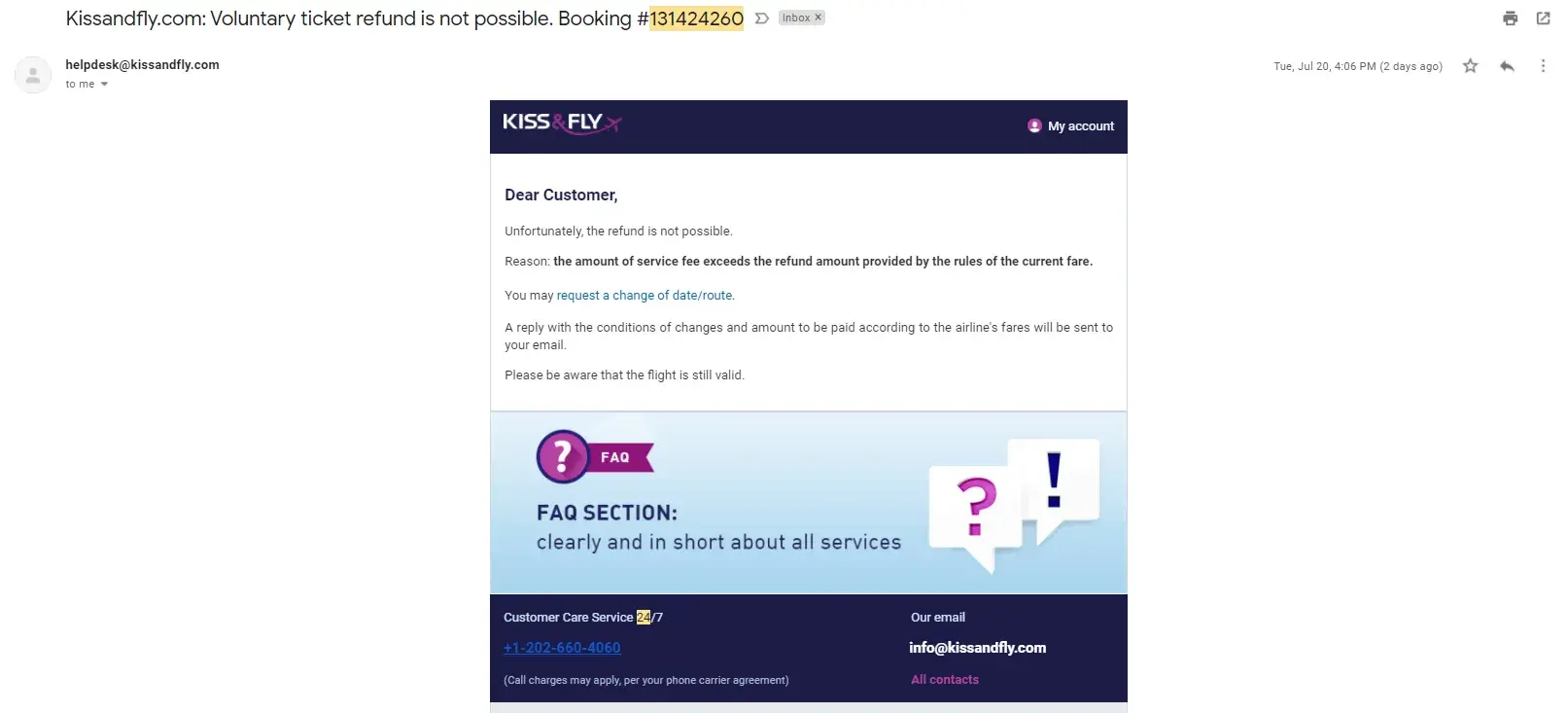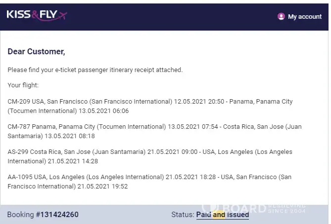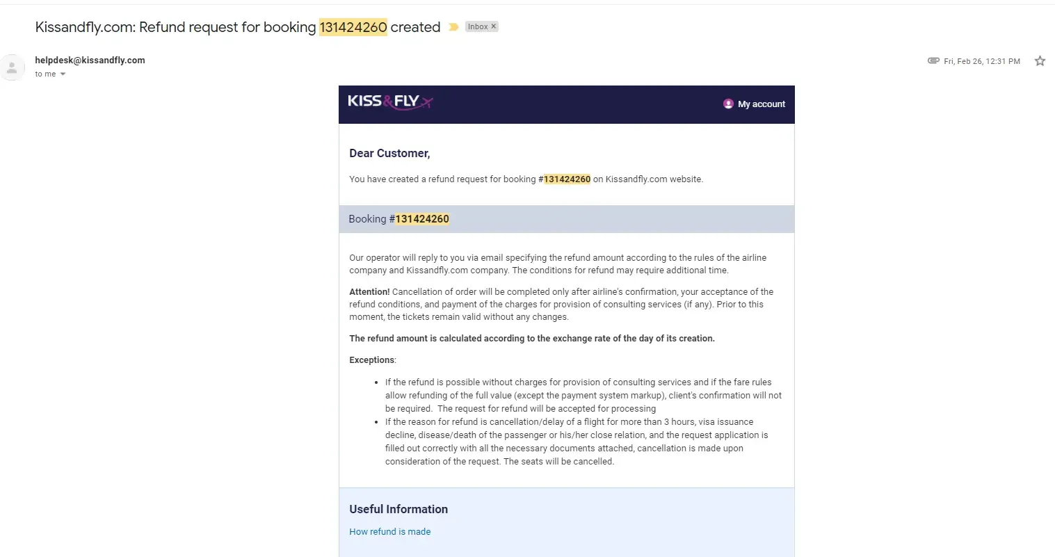 They will tell you that they are working with the airline to coordinate your refund, but in reality, nothing is happening. I'm even questioning if those tickets that were purchased and sent by email were real and not autogenerated by the bot or something. There is no way to validate it with the airline either. Once I contacted the airline they referred me to Kiss And Fly and they said that I should coordinate everything with them. The next logical step was to submit the dispute with the bank, but I can tell now, that Kiss and Fly know about these practices and they will trick everything. So despite the solid proofs you unlikely to get your money back this way. Be aware and don't fall into this trap.