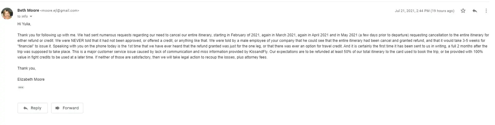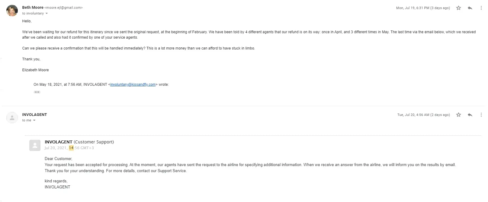 -Several minutes later, I found two emails from them. One that appeared to be a templated email sent July 20th, 2021 from an auto-responder stating that they could not approve our refund request at this time, but that we could request a change of date/route regarding the ticket, and with a notice that the flight was still valid. (Clicking through the reschedule links, it takes you to a page that shows the schedule is frozen, and no changes can be made to it.) This is the email that we should have received in April/May, prior to our scheduled departure at end of May, that would have alerted us to there being an issue. It was obviously sent as a "whoops! Better get this in there inbox so we can say we told them" email. However it arrived two months too late. It also offers us the opportunity to make changes that we obviously cannot, due to the itinerary having already passed.