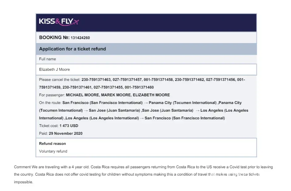 -Requested voluntary refund in Feb 2021 due to COVID testing limitations in Costa Rica for our 4 year old child that would make travel impossible.