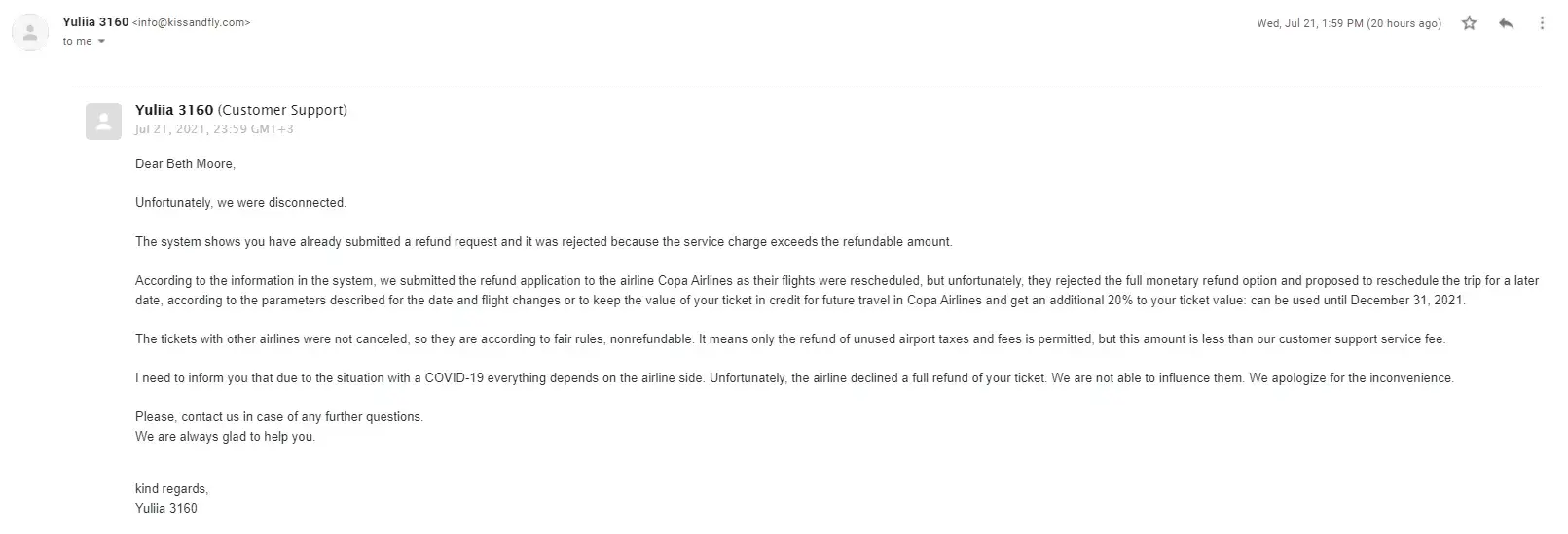 -The second email was sent from their [protected]@ address, and was addressed to me from "Yulia." It is the first communication from them that states that our refund request was not approved, that there was an opportunity to reschedule the flight with Copa, who apparently added a 20% credit for the inconvenience. It is unclear to us if we have access to that flight credit or not, and no information has been shared with us about how we may use it. It is also unclear if this is for the entire itinerary or for just one leg of it.