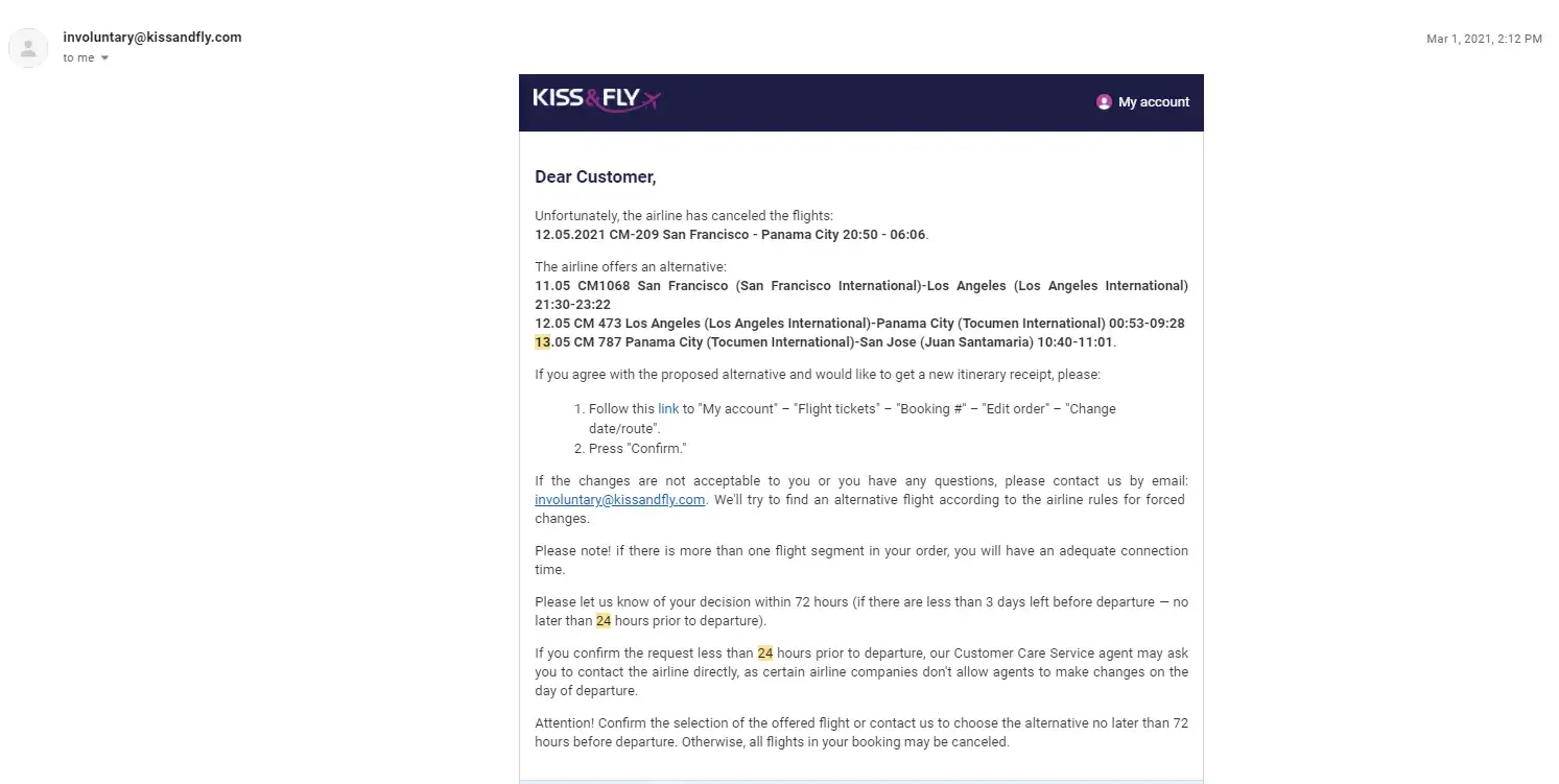 -Was alerted by KissandFly in February that the first leg of our trip was cancelled by the airlines, and they offered us alternative flights.