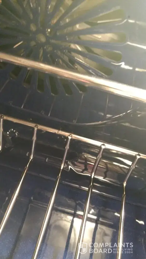- The cowling plate of the convection fan inside the oven has a 3 cm x 1 cm long section of enamel chipped off.