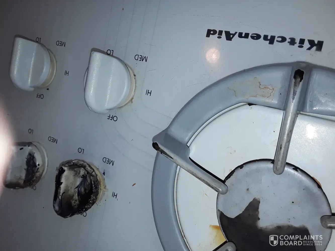 control knobs which are fused in place and cannot be removed or rotated. Additionally, there is fire damage to the overlying cabinets.