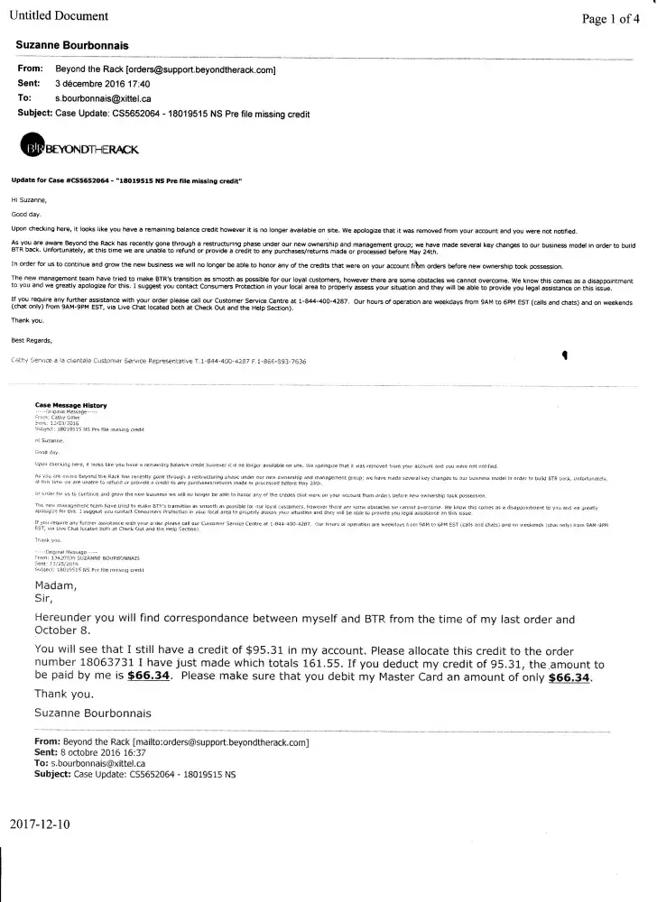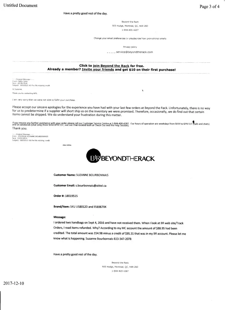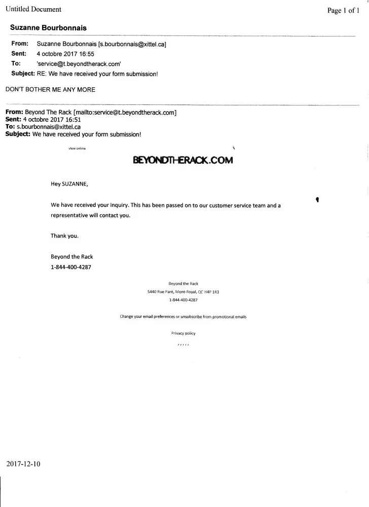 I am receiving numerous unsolicited promotional ads from Beyond the Rack even after I sent a last request on October 4, 2017 to not bother sending me promotional ads anymore. (Please see Case_CS576077, _Unsubscribe and Unsubscribe_page_1) I have good reasons to not want to deal with BTR anymore. They owe me money. (Please see Case_CS5652064_[protected]_Prefile_missing_credit)