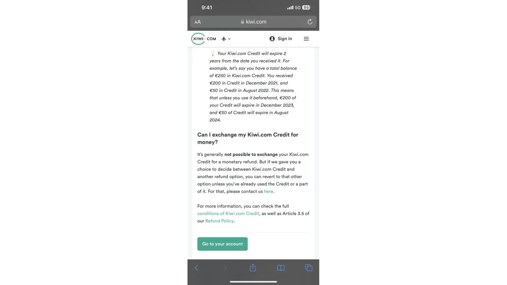 I miss read the refund option kiwi gave me. I asked to revert back since I have not used the credit issues as according to policy, this is the only case someone qualifies. They refuse to do so. I found the policy which I included below.