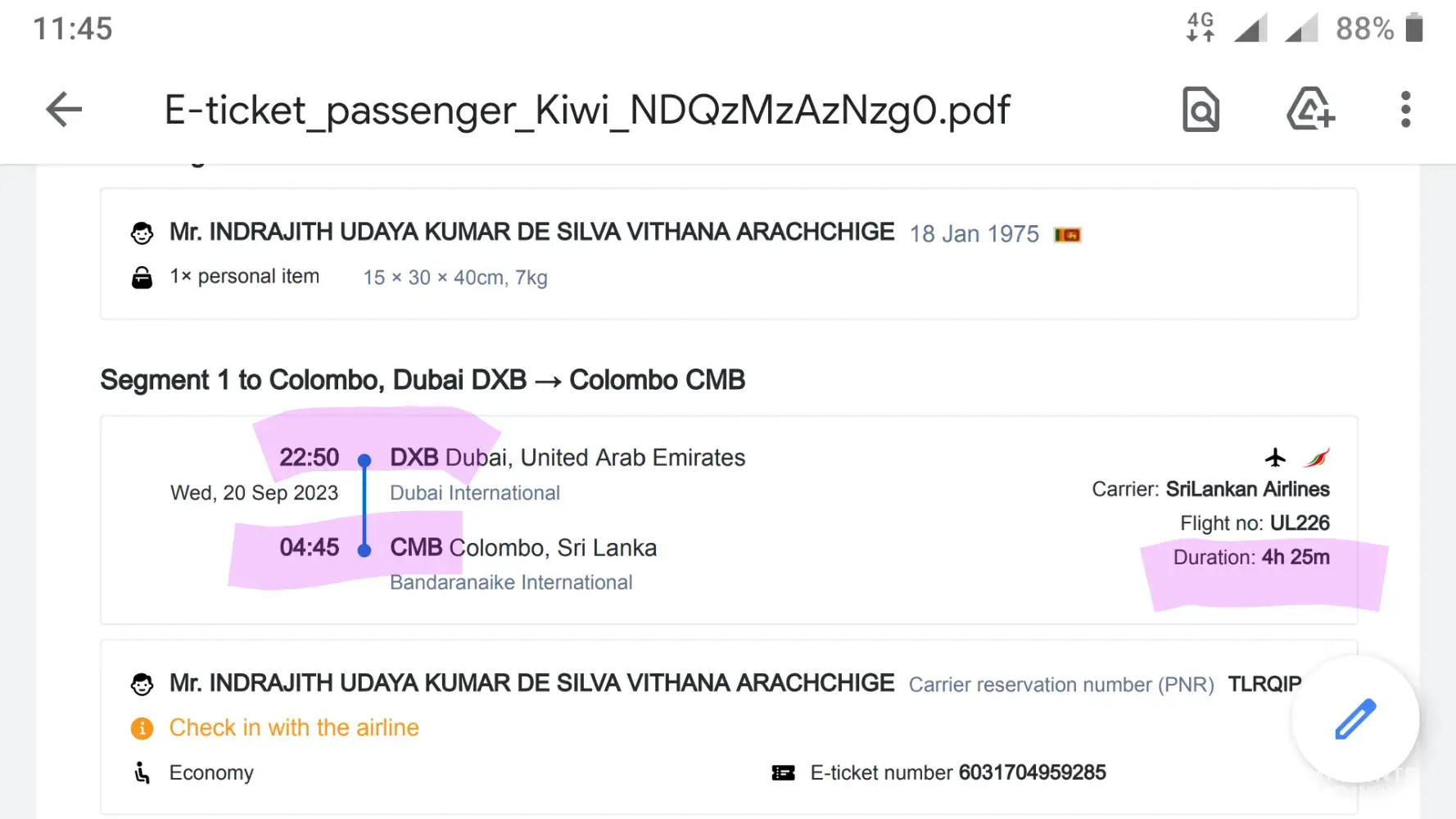 I booked Sri Lankan airlines on 19th September via using the Kiwi.com online platform. It was very clear that the direct flight from Dubai to Colombo, the flight is on 20th September with flying duration 4hrs and 25minutes.