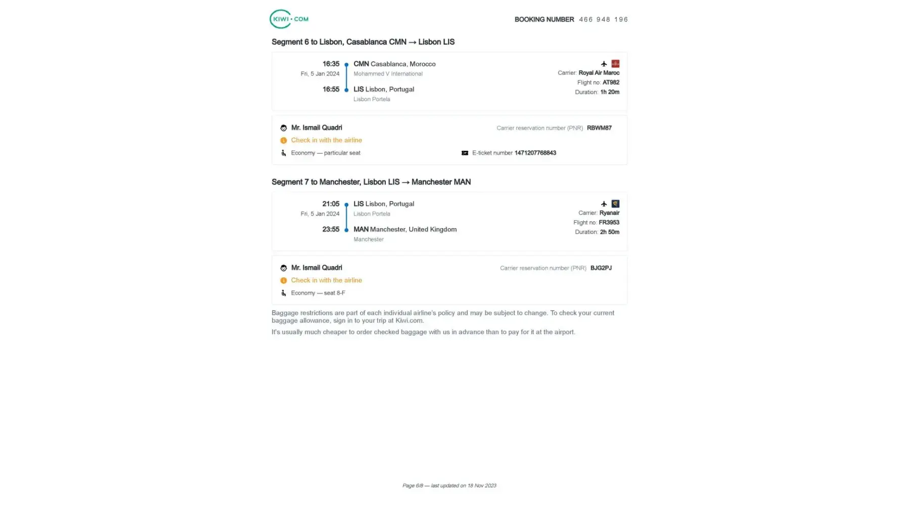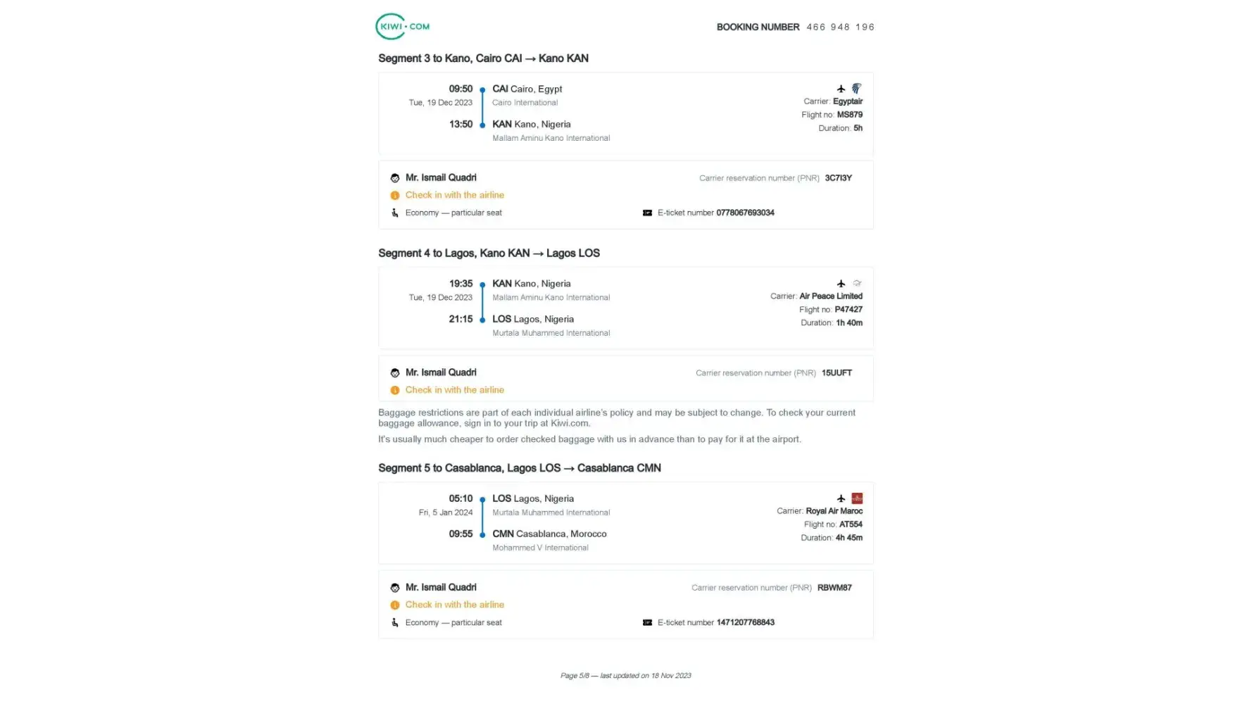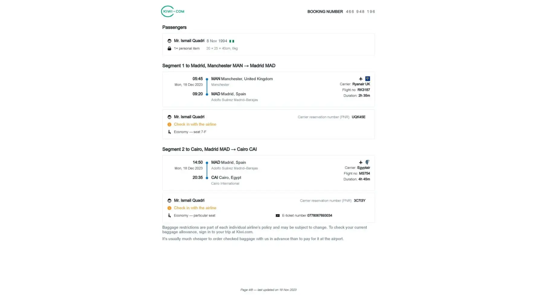 I created an airline booking through Kiwi.com on 11/27/2023, but the booking dates were incorrect.