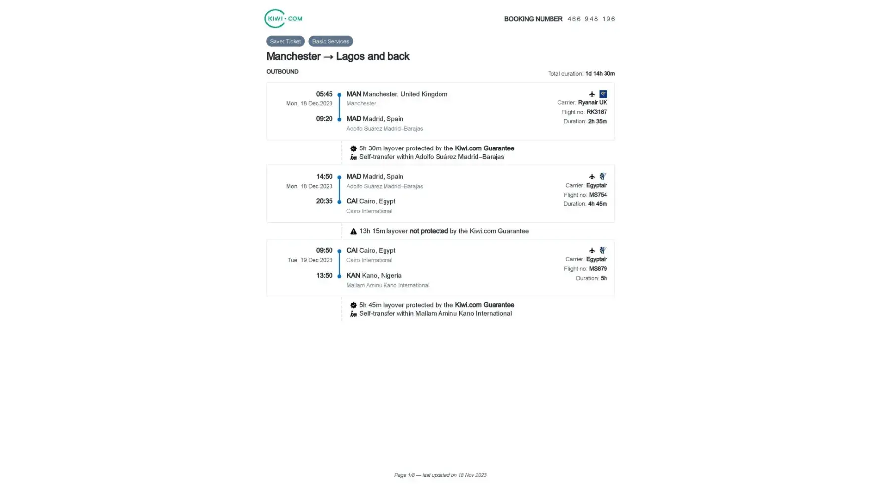 We were disappointed with Kiwi's service and we advise others not to use them unless they have the time, money, and energy to spare. We had no consumer error and made no mistake while booking. We arrived at the airport early and our flight was planned as scheduled. The only issue was that Kiwi failed to provide a working reference number for one of our two tickets. This mistake cost us an extra $584.94 in new flight tickets, approximately $206 for an international phone call to rectify the situation, and 3 hours delay. We have read many negative reviews about Kiwi and it's clear that this company does all that they can to shirk responsibility for their mistakes and maintain zero accountability.