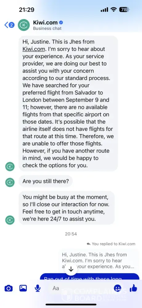 Now, I get that Flybe going under wasn't kiwi.com's fault, but their lack of customer service was a real bummer. I mean, if they were a five-star service, they would have hooked me up with an alternative flight at no extra cost. But nope, they left me high and dry. As a customer, I expect more from a travel agent than just a booking system. I want them to be proactive and help me out when things go wrong.
