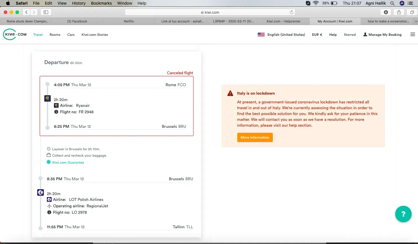 I booked two flights through kiwi.com and on their page it showed the first one from Rome (FCO) to Brussels (BRU) on March 12 2020 was cancelled. I also talked on the phone with an agent who confirmed the cancellation. After getting that information I booked another flight for the next day and changed my second flight Brussels (BRU) to Tallinn (TLL) for the next day too. Since it was the lockdown situation in Italy I had to grab a chance to get out of there to get to my home country. As it turned out the information was false and the flight on March 12 was not cancelled after all. I only discovered it through talking to a Ryanair agent who confirmed the flight was not cancelled. As from Kiwi.com they asked me to call again the next morning after talking to them but of course the lines were overbooked and I even didn't get a chance to talk to them again. So I took the flight on March 12 and let my flight which I had bought through another website for March 13 go. Now, since I had already re-booked my flight from Brussels to Tallinn for March 13 I had to spend the night in Brussels and take a hotel. In the morning when I tried to do the check in it turned out there was no flight for me any more! I went to the airport and the agent said there is no flight under my name for 12 nor 13 of March. Luckily she was kind enough to rebook me on the flight of March 13. Now I am waiting for my flight from Brussels to Tallinn on which I should have been 24 hours ago. I will add the document that says the flight is cancelled.