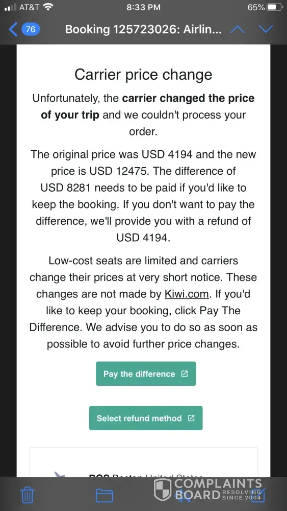 Four hours later, I received an e-mail from Kiwi stating that there was a "price increase" and they needed an additional $8281 in order to book my tickets. This means a $4194 became a $12475 fare!