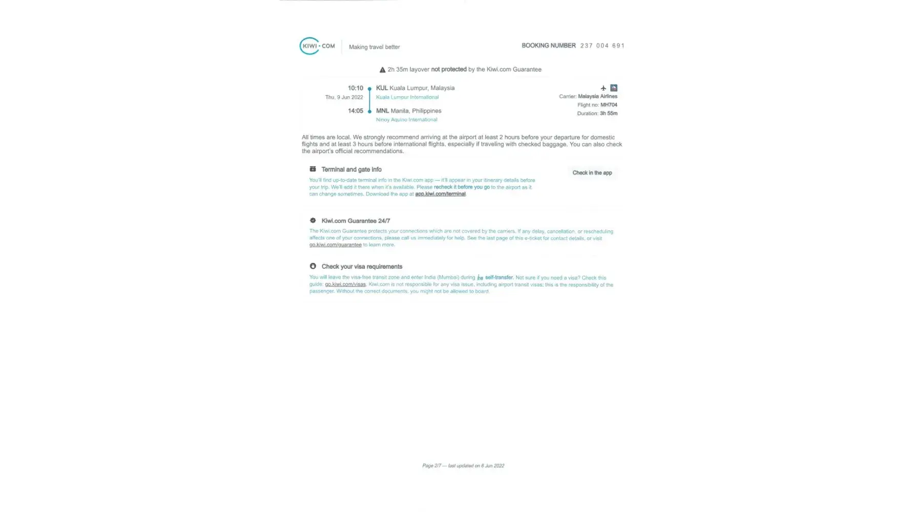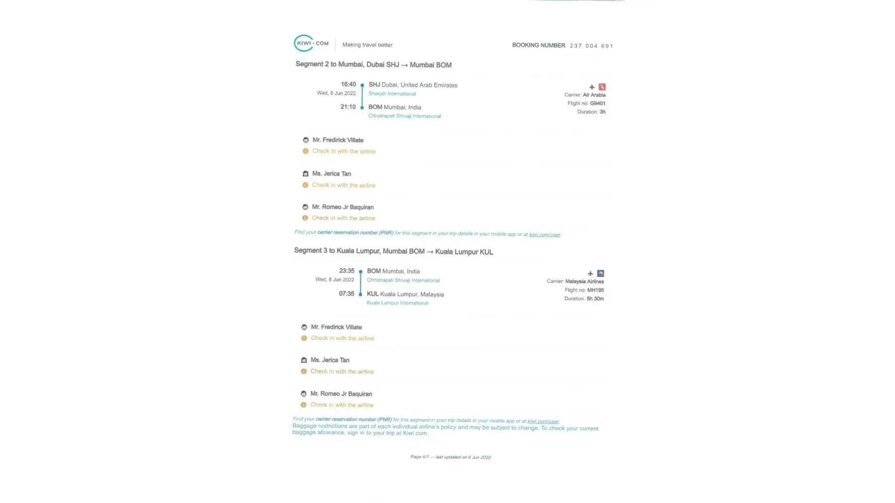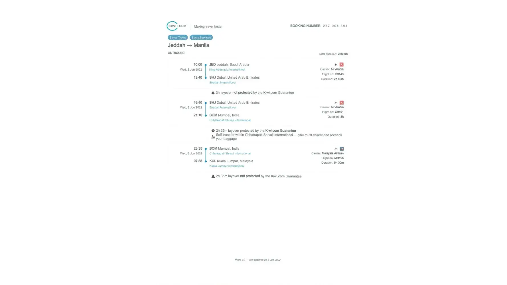 1. We purchased tickets via KIWI.COM but we were not informed that a transit visa is needed in Saudi for layover that is more than 12 hrs. As a result, we were unable to use the tickets. So what we did was, we immediately contacted Kiwi to request for a change of itinerary (Kiwi email file). Accdg to their rule, changing is allowed as long as reported within 24 hrs. After that, we did not hear anymore from Kiwi despite several follow-ups. We ended purchasing tickets from another airline. We were not able to use the flight tickets purchased from Kiwi.com. This is supported by the passenger manifest of Air Arabia & Malaysian Airlines.