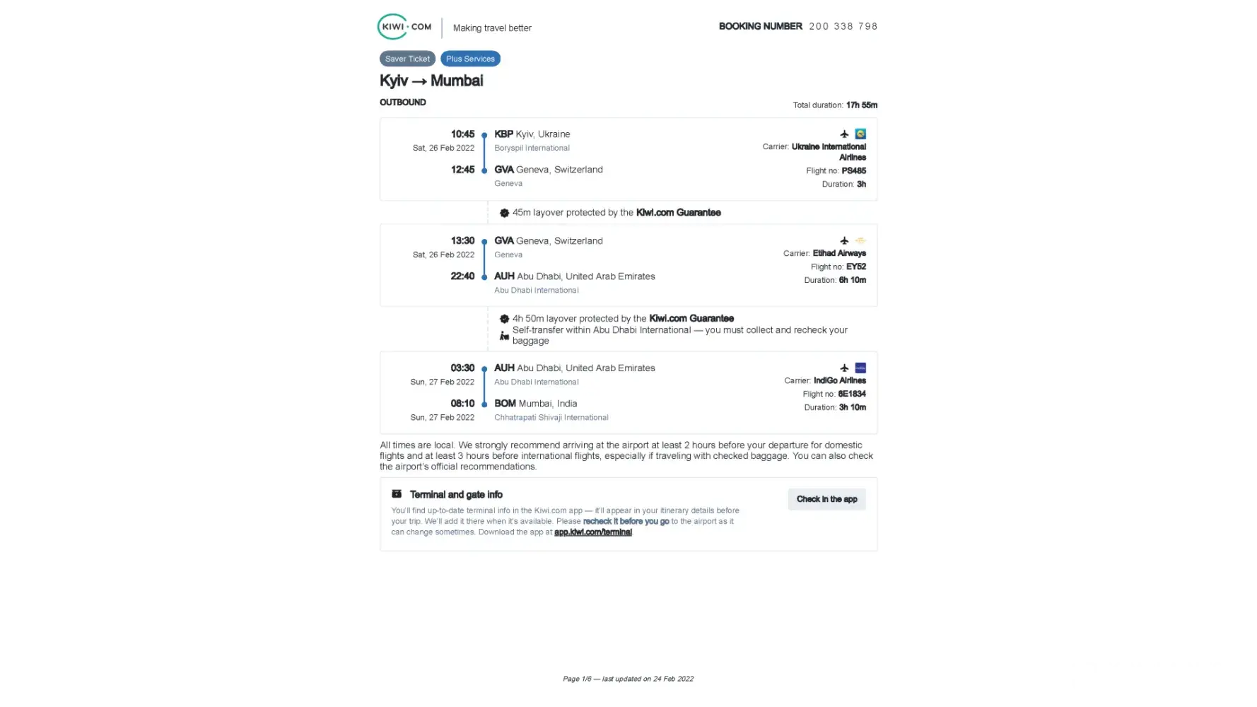 I booked a flight ticket from Kyiv to Mumbai on 26 Feb 2022 (Booking Number: 0 2 0 0 3 3 8 7 9 8) on Kiwi.com.