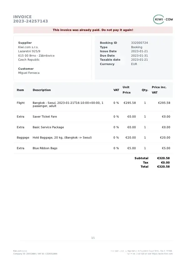 On December 23rd 2022, I purchased three independent tickets from Kiwi.com (as described in the attached invoice) and I was unable to board the first of those flights.