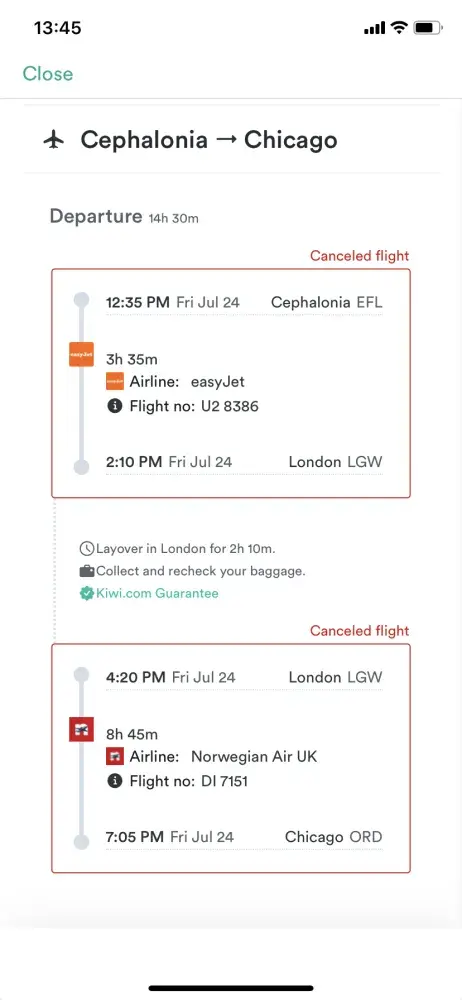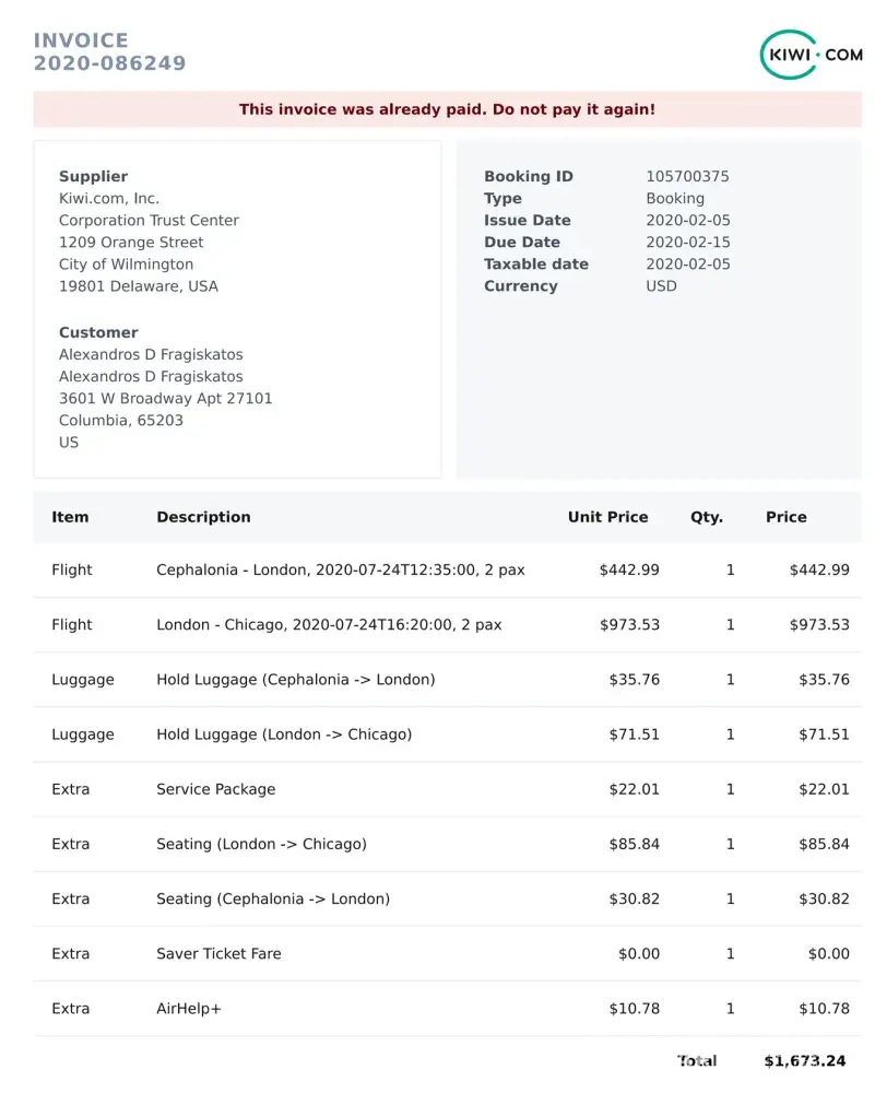 On February 5, 2020, I purchased airfare for 2 travelers through Kiwi for travel from Cephalonia, Greece to Chicago, IL on Jul 24, 2020 for the amount of $1, 673.24. My booking number is [protected]. Also, on February 6, 2020, I paid $12.74 for extra baggage. On June 18, 2020, Kiwi informed me that both legs of the flight (easyJet flight from Cephalonia, Greece to London, England and Norwegian flight from London, England to Chicago, IL) were canceled. Because of this, and the fact that they could not provide any suitable alternatives, I requested a full refund. For over a year I have been strung along in sparse communication with the company. So far, I have only been refunded $983.91 meaning I am still owed $702.07. According to Kiwi now, the easyJet flight was not actually cancelled so they did not plan on refunding me that portion. However, I have a screen shot from my Kiwi account when they said that both flights were cancelled, showing the words "Canceled flight" next to both flights. I have been taking notes on all my interactions and I was told on the phone that I would be receiving a full refund. One particular conversation happened on October 7, 2020 with Devoshesh (spelling?) who said Kiwi should be held responsible if this were the case. A week later on October 14, 2020 I spoke with Lab who responded affirmatively when I asked if I would be refunded the $702.07. However, since then, I have not been able to get in contact via phone, only chat messages. I am always told to please wait 48 hours, or please wait while the finance team investigates this, or please wait for my Team Manager to look into this, etc. Also, no one has responded to me in the last 2 months, so communications have effectively ceased.
