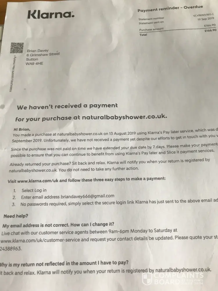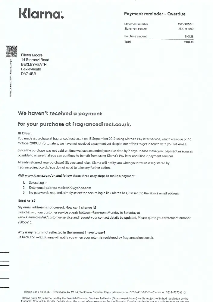 I have received a letter from Klarna (forwarded from an address I have not lived at for 18 months) .
