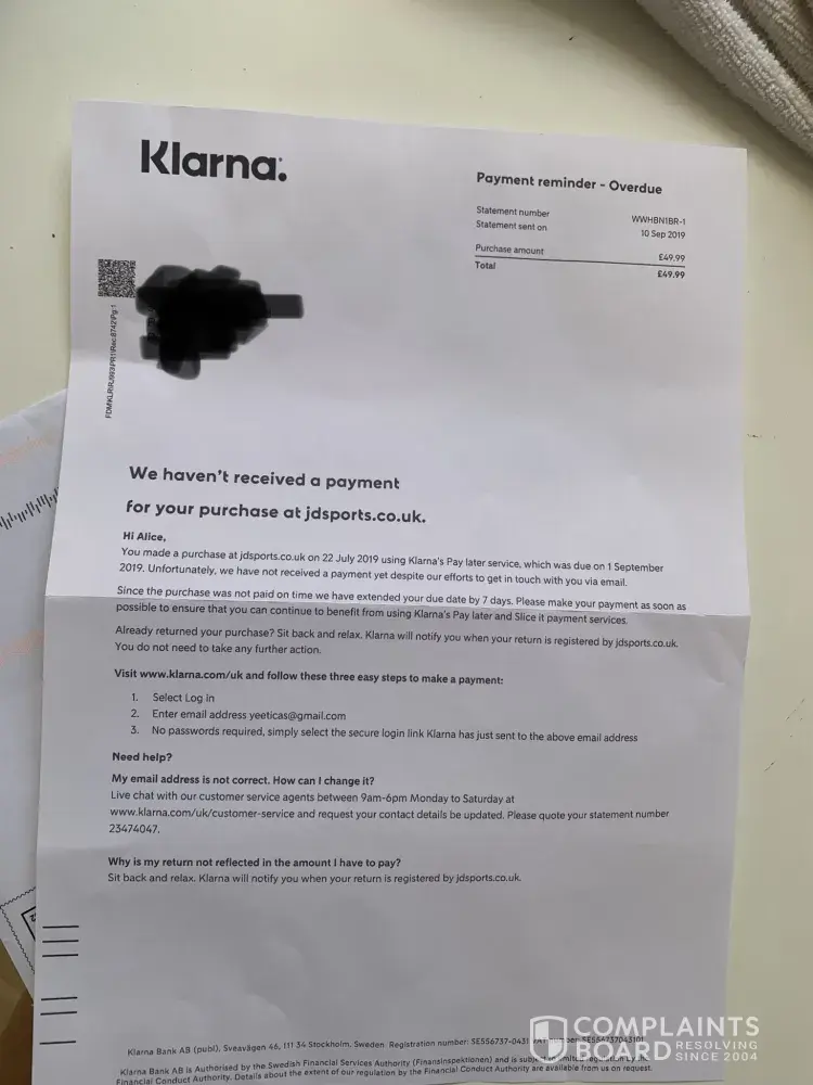 I've received a letter from a company called Klarna, with regards to a purchase I allegedly made from JDSports (where I never shop). This is for £49.99!
