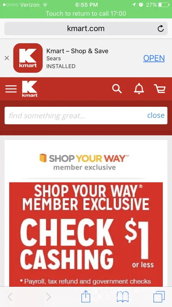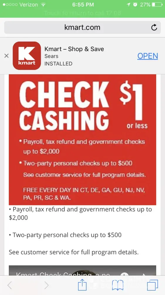 Local store rapid city sd refused to cash a personal check under $500 by a shop your way reward member. They advertise this on their website and many sites give publicity for this exact policy. I have screen shots showing the Kmart.com publishing this policy as well. But when I called ahead (live hour away) to ask costumer service to cash a check they refused and said government issued checks only.