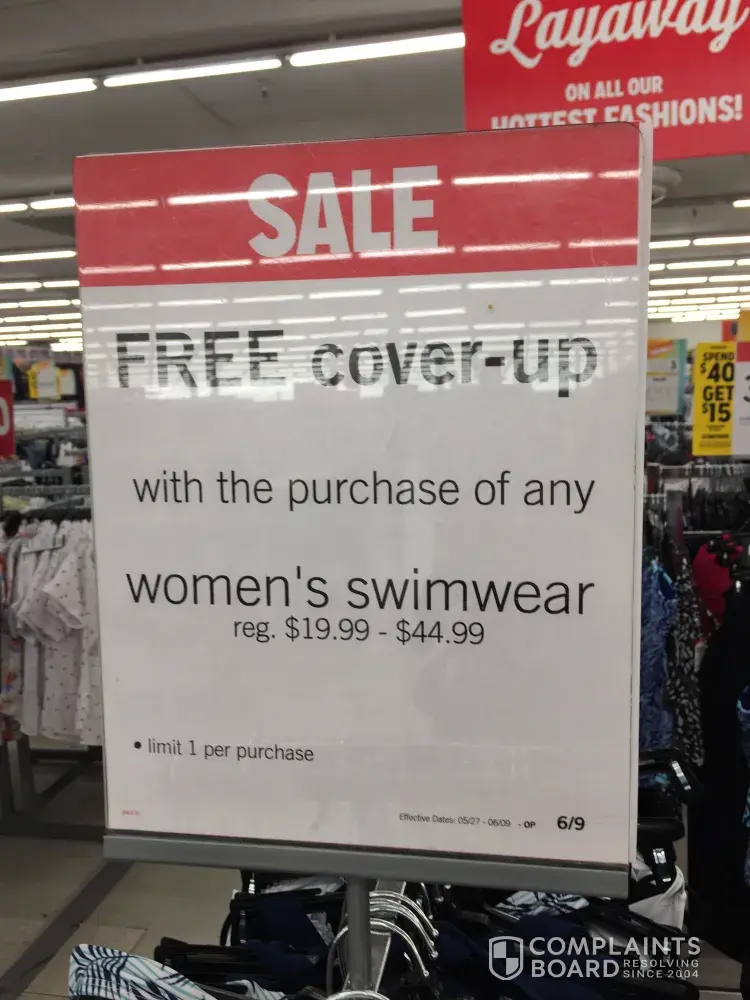 I was shopping at your Stockton, Ca store today on Sunday, May 27. I found a bathing suit that was regularly marked $19.99. I saw the attached sign - there were 2 up in the store. Buy ANY bathing suit and receive a free cover up. I questioned it at the check out. The girl came back from talking to a manager on the phone who told her it had to be a certain brand bathing suit. I read the sign again- then questioned customer service and she said it had to be a certain brand and also said they needed to take down the signs. She refused to give me the cover up. I was very disappointed in the customer service! The manager only talked to the employees on the phone and should have come and talked to me and honored the sign. Signs should not be up if they aren't honoring them! There was not a specific brand on the sign- I will attach it! I will not be returning! Very poor customer service by the manager!