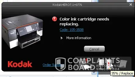 WILL NOT ALLOW ME TO USE THE LAST 35% OF THE INK IN CARTRIGE. An error message comes up to say I am out of color ink (code 3508), When in fact the cartridge still has at lest 35% ink left. In an HONIST company, the error code would come up to let you know that you are getting low in ink, but KODAK stops the printing process until you change the cartridge. You can't even take it out and put it back. This is a robbery of 35% of your ink for every cartridge. If a gas station tried to take 35% of you gas there would be hell to pay!