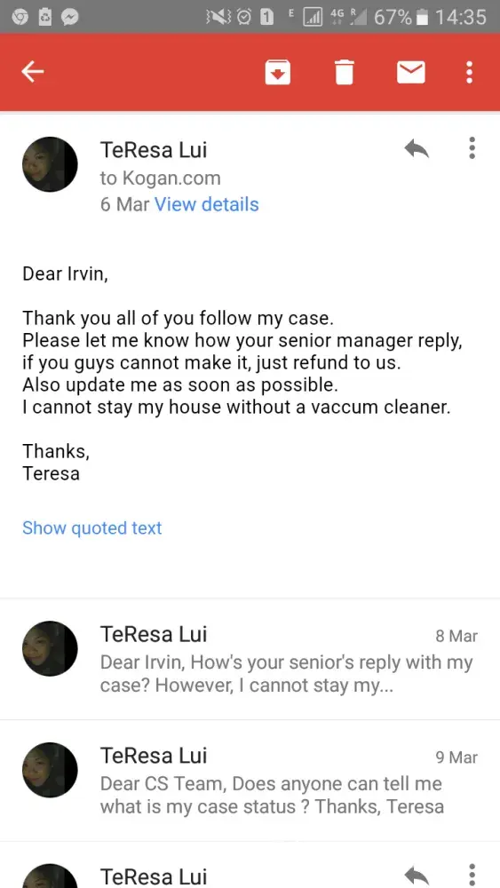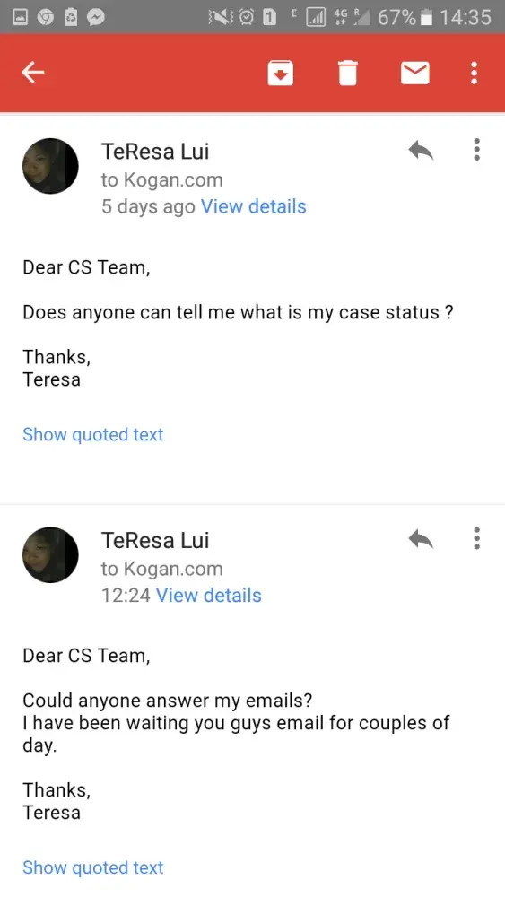 My request number is #6469639. Read my 36 emails from Kogan not including mine and you will see why I'm so annoyed.