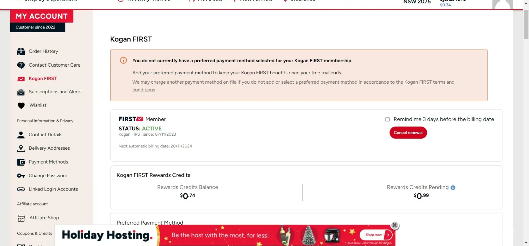 I recently made a purchase on August 17 2023. Unknown to me came an optional subscribtion to Kogan First before checkout, with a subscription box that had been ticked without my doing. Which I never needed nor wanted.