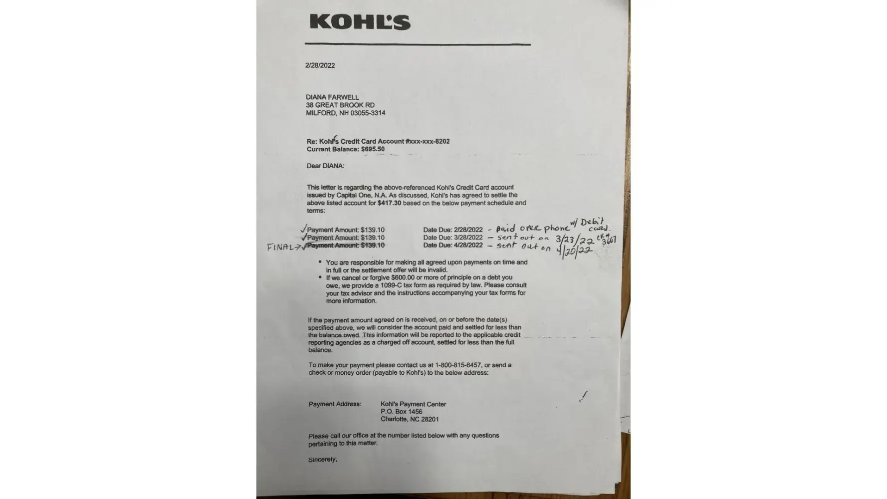 Conf# 367901; on February 28, 2022 I called Kohls representative in the credit department I believe and we made an agreement for a settlement payoff of the amount of $417.30 equaling three last payments of $139.10, initial balance of $695.50. In agreement the first payment due immediately over the phone charge was fine for $139.10. On the recorded agreement I told the representative that the last two payments would be in a check form. I must have misunderstood that Kohls was also going to automatically charge my bank for the last two final payments of $139.10 each. So at the same time I sent the last two payments in a check form. So in reality I was double charged for the last two final payments of the agreement we made on February 28, 2022. After numerous phone calls to Kohls to try to resolve this day have instead took it upon themselves to credit my Kohl’s charge card for $278.20 . This is not right for we made an agreement and that is my money that should be returned to me for it is a simple mistake that can be resolved right away.