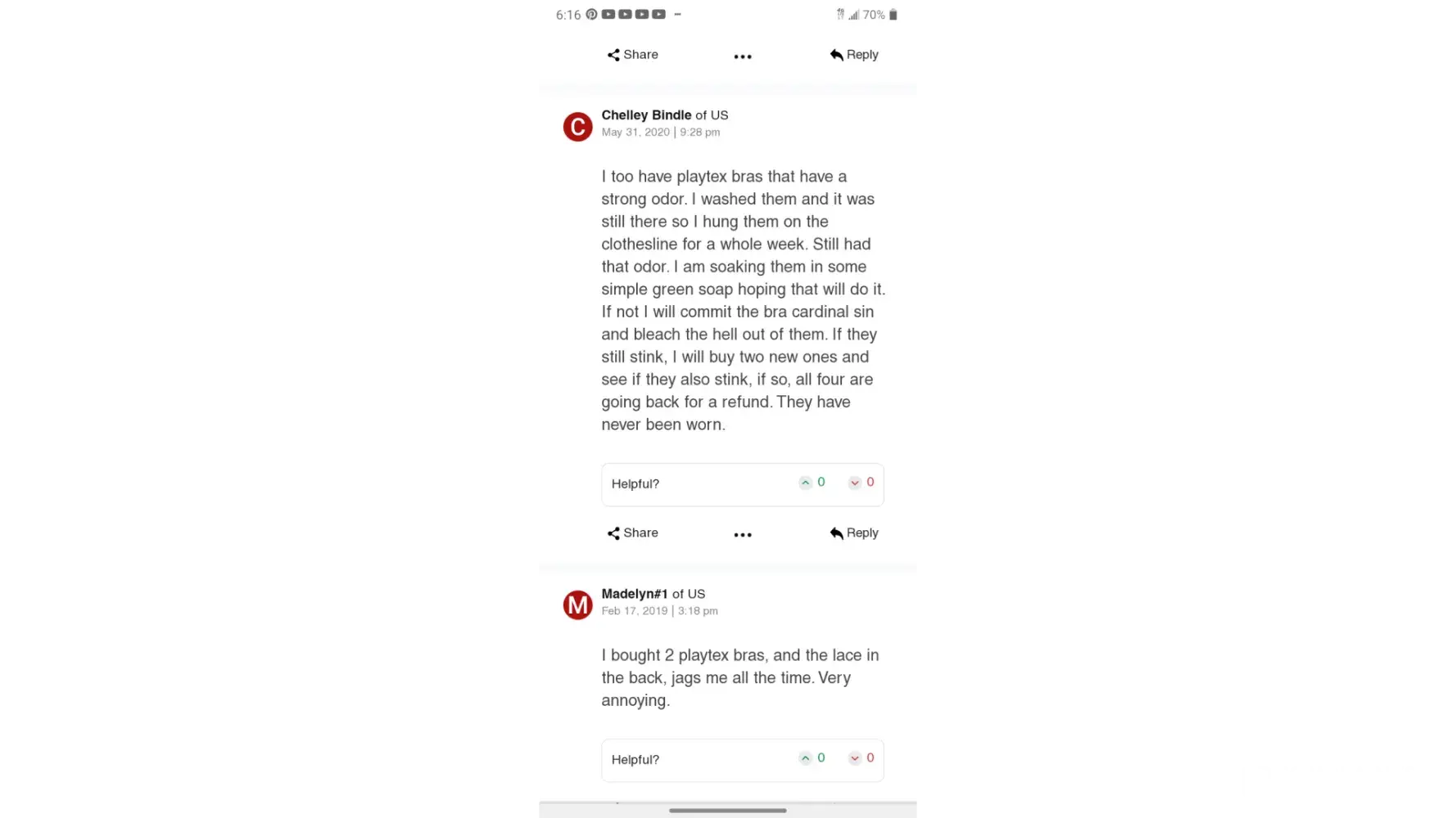 I purchased 2 Platex 18 Hour Bras approximately 2 months ago. I have been a fan of this product for many years. I purchased these two bras at the Kholes in Menifee CA. The problem I have with these bras is that they have an odor that I can't get rid of. I have tried soaking them in Downey, bleach and that stinky smell remains. It's body odor. I have saved some reviews from others who are experiencing the same thing. I can't return them #1 because they have been worn. I was hoping that after a few washes the smell would go away. #2, I have no receipts. I decided that I would just wear them around the house like an old dress but I stink. You might want to stop selling them. I will upload the complaints from other people for you to read. My Credit Card information is