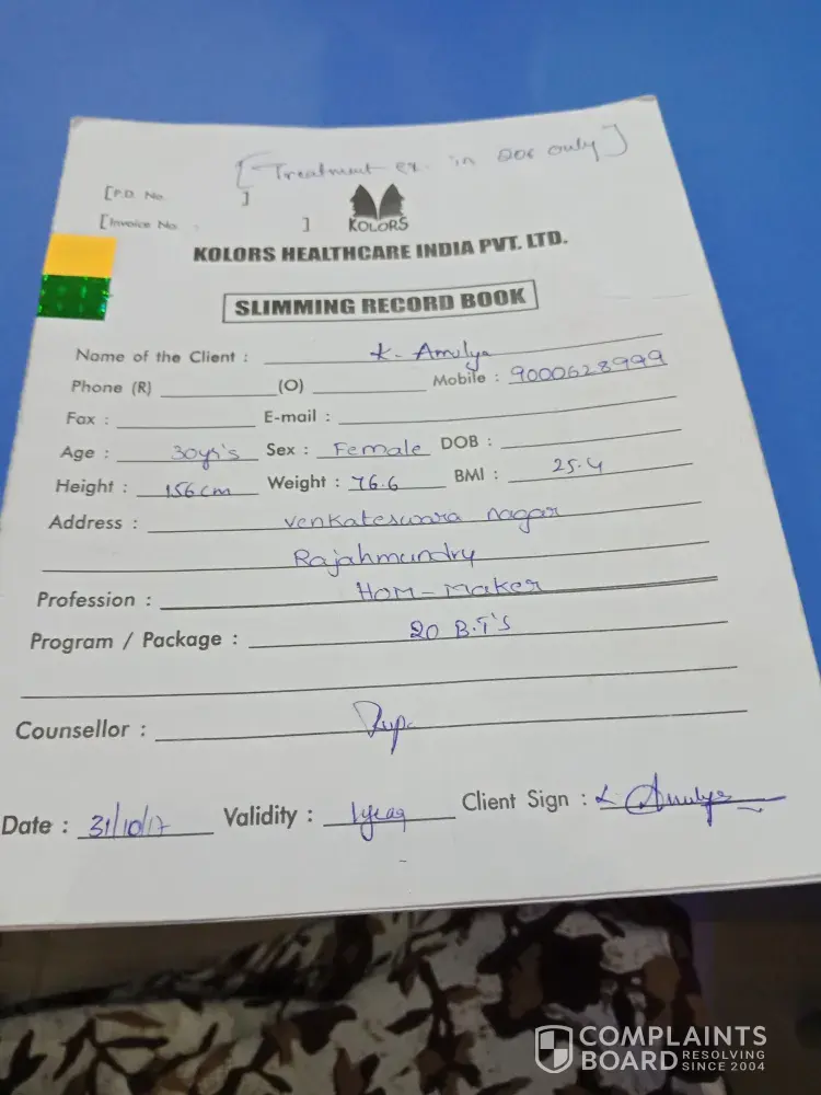 Hi.. Asha here from Bangalore. I joined Kolors for weight reduction program paying 10, 000 initially with Bajaj Finance loan for total package of 50, 000.00. Initially i took 2 sessions and there was no such result found and i came to meet the clients during the session and they explained me its difficult to reduce after 2-3 kgs and not able to met the targeted weight reduction. Now i want to get out of the plan. I also confirm that I have undergone the 2 session which is already paid by me. Now, i here by request to refund the amount to Bajaj Finance which you people have taken with them and I have not taken any kind of treatment.