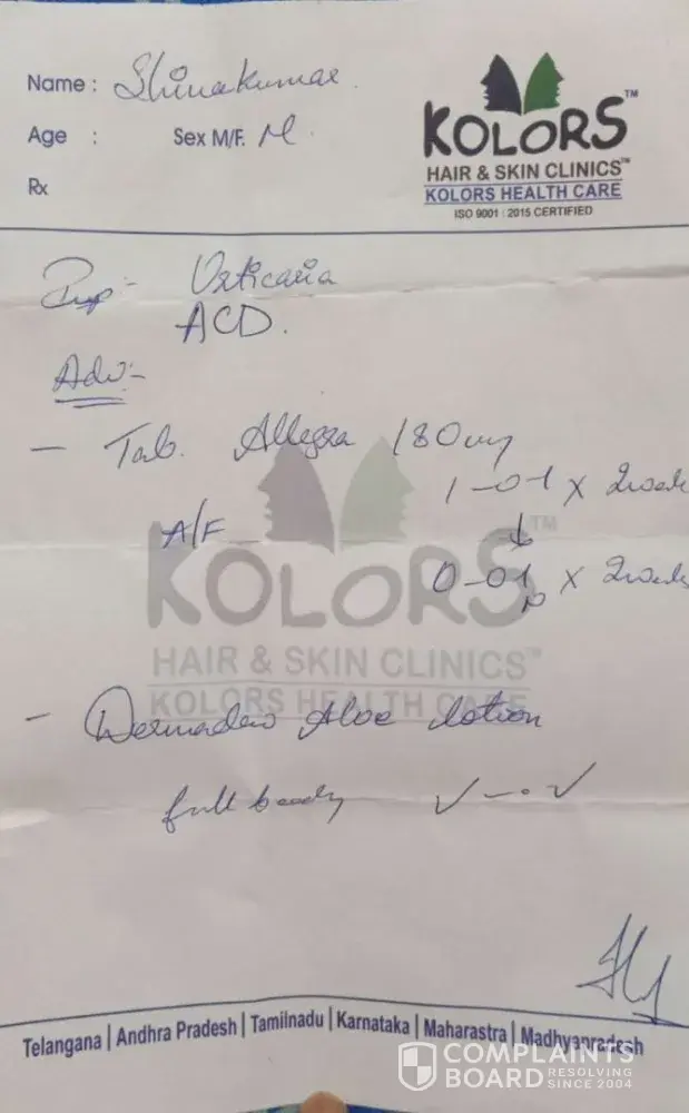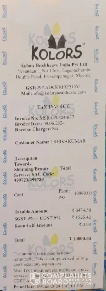 Dear all, I'm Alekhya and 23 yrs old. I was diagnised with rheumatoid arthiris an yr back and due to medication i put on 25 kgs.. So watching their advertisemnt on tv i opted for these cheaters.. Initially they spoke very wel till we gave them the entire money.They dint even give proper bills and no guarantee. after paying money they just leave yu unattended. I was charged 75000 fr 20kgs weight loss. Till now they dint give me prper seating only. Now when we are asking them they reply very arrogantly saying they r busy. I could affrd this 75000 but still managed to pay just becoz of my health issue i was very desperate abt losing my weight. They told me no heating pad with me kept and only massages will be given.But this is all FALSE. All they do is make you sleep under heat pads. Please dont put your hard earned money on these cheaters.. I just feel i have trouble my parents a lot in put all the money in this Stupid treatment. i JUST hope government takes necessary actions against these people as they making people sign on some papers with stupid terms and condtitions and they not even leting us read and covering up everything with sweet words. The MD of Kolors should be sued by the Court of Law. Please someone take action against these people.