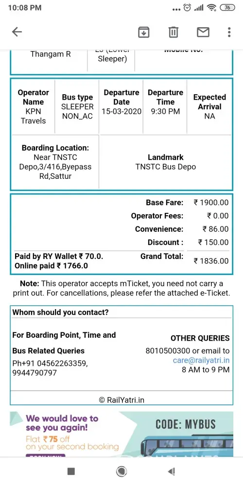 10) No proper contact no for the passengers to Enquire about the bus (in M-ticket). If so, it's not reachable/switched off..