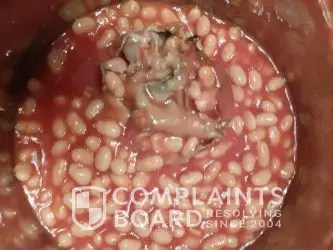I removed the lid and the contents looked fine until I poured them into a saucepan when a large 'mass' came out of the bottom of the can. (see photos 2 & 3) It was pink on one side and mottled with dark grey on the other side.