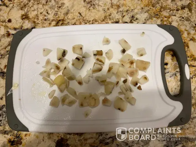 Attached is a photo of the pieces I cut off the diced potatoes. I had to examine each diced potato to be sure no dark pieces were included in my casserole. This was time-intensive and also disappointing, as I expect better quality control from your company.