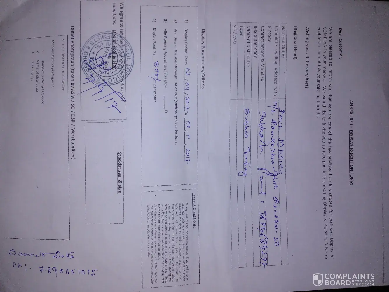 This is to inform you that I am subhash paul and I am having a retail counter named paul medico in which we sale your products, now the matter is that some few months back approx 7-8 months back I had signed an contract regarding display whose amount was 2400/- (rs 800/- per month) for three months, but still now I didn't got my money only rs 800/- had been paid and an amount of rs 1600/- is still now due. They had also taken a canceled cheque from me they told that the money will be credited in my bank a/c that was also not done.