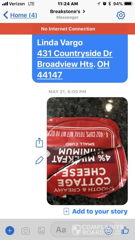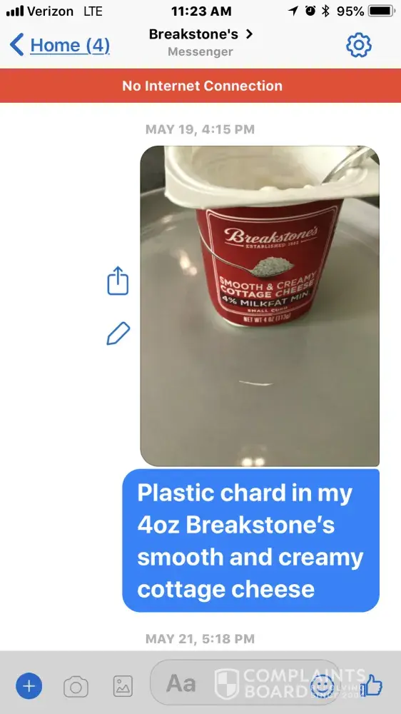 On Saturday, May 19, while eating a 4 oz. Breakstone's smooth and creamy cottage cheese cup (with a metal spoon), a small, sharp, white, plastic chard (picture attached) ended up in my mouth in a spoonful of cottage cheese. For obvious reasons, I reported the incident immediately (via Facebook Messenger) because I couldn't find a way to do so on your website. I received (what I feel to be) an inappropriate response on Monday, May 21 (see attached screenshots).